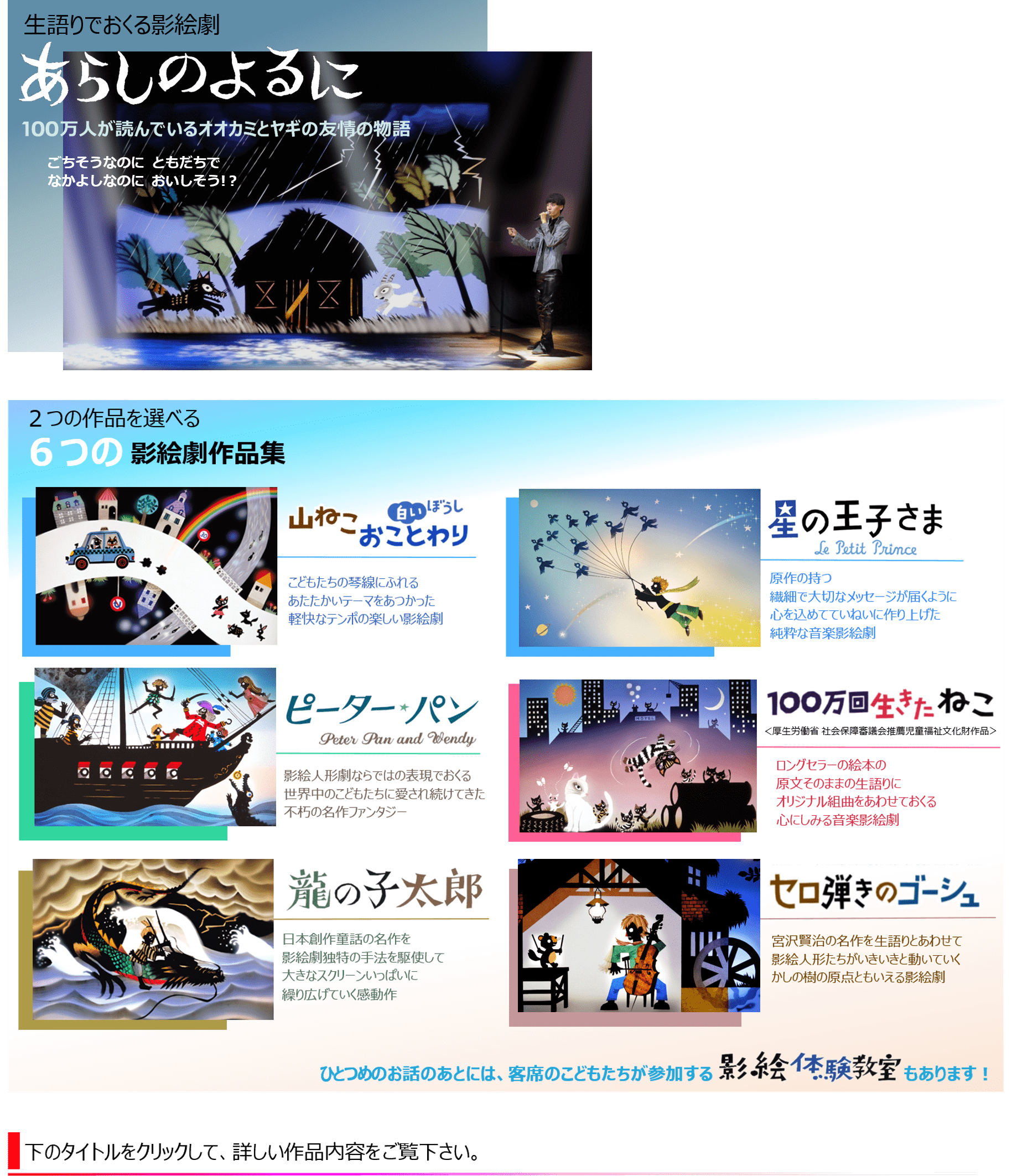 日本の創作童話と海外の名作より選んだ6作品です。美しい音楽と透明な色彩、繊細な影絵人形の演技力、そして楽しい司会のおしゃべりでおおくりします。